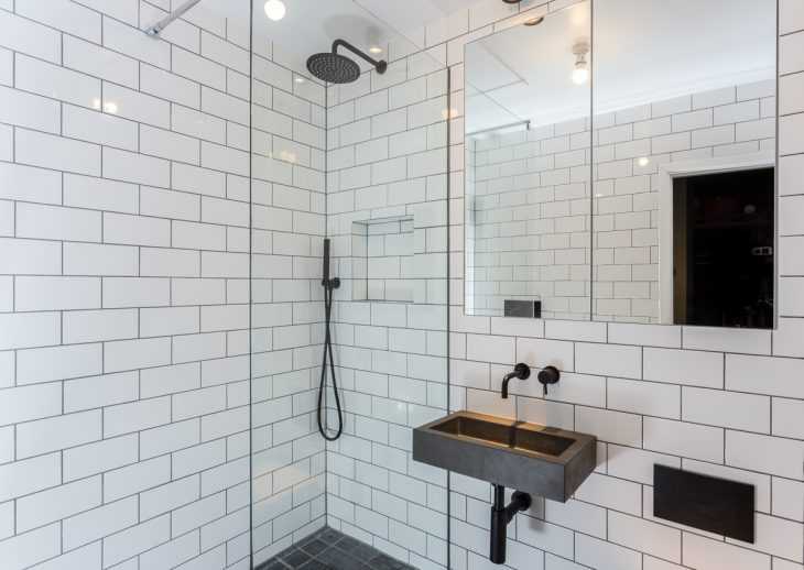 fake partition wall to conceal cistern and create flush mirrored joinery above the sink. This allow allowed for recessed storage in shower area