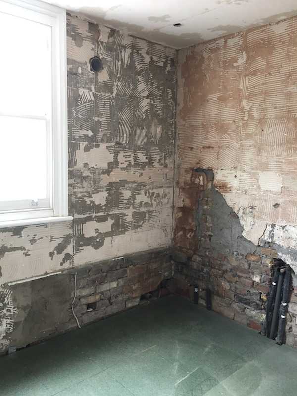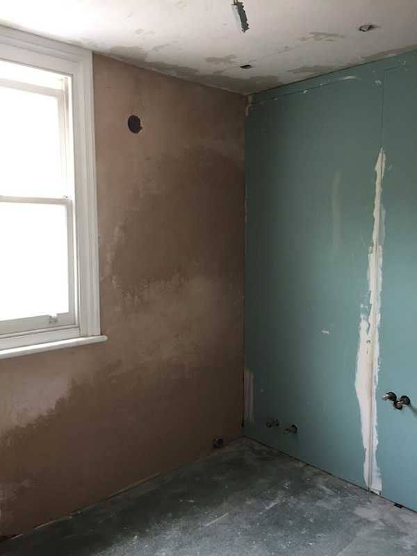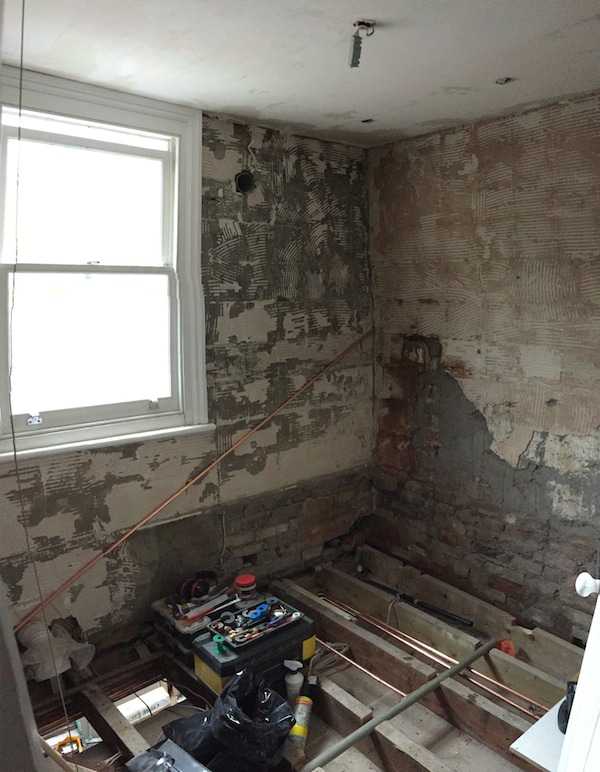 Picture below shows bathroom fully demolished with all plumbing and floor boards removed. At this stage ceiling has been replastered with rendering mesh bonded on dry wall adhesive prior to the skim coat to avoid cracks in the future.