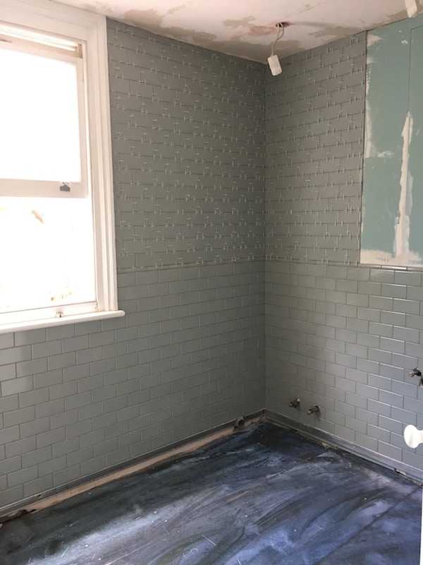 Last tiles that get installed are the bottom row of wall tiles once the floor tiles are down. Grouted walls and floors on next picture.