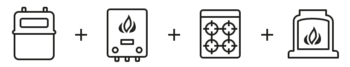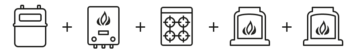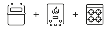 Gas meter + gas boiler + gas hob or cooker + gas fire