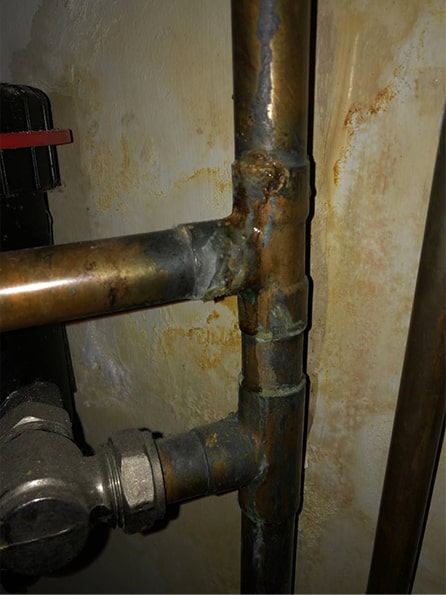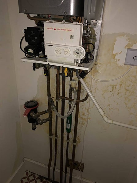 When I got to site, I was met with this massive leak coming from the boiler pressure relief valve that has soaked the whole wall.